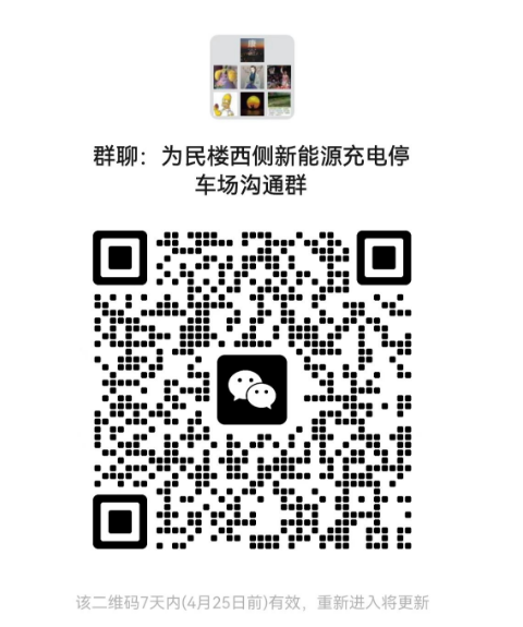 3、请有新能源车辆充电需求的教职工车主加入“为民楼西侧新能源充电停车场沟通群”(沟通群二维码见下图),以便于进行通知、沟通、举报、投诉、违规通报等相关事宜的处理。