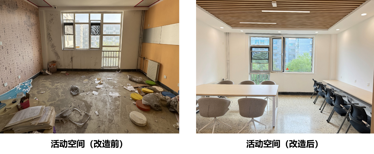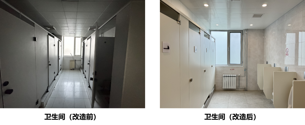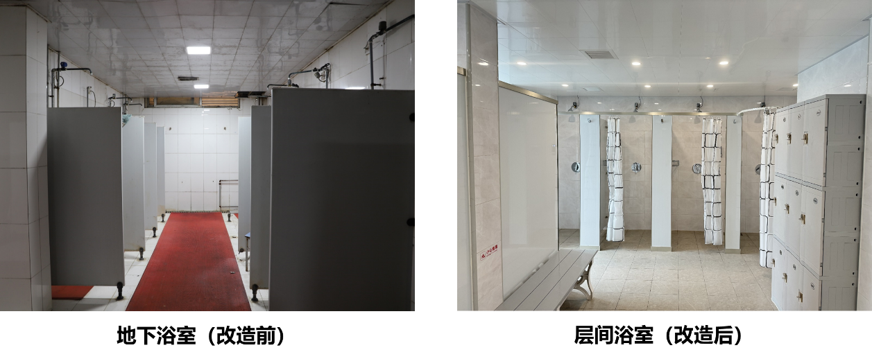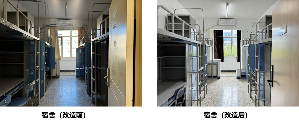 改造重点从六个方面改善住宿条件,一是浴室升级改造,从地下室大浴室集中洗浴优化为每层就近设置浴室供学生洗浴,增加总喷淋头数量。二是盥洗室、卫生间翻新,配套设备设施全部新做,盥洗室实现热水供应;卫生间实现低层高压供水,解决卫生间水压不足问题。三是宿舍住宿环境优化,入户木门更换为钢制门并配备电子门锁,消除安全隐患,使用更加便利;塑钢窗更换为充氩气断桥铝窗,优化外窗节能效果。四是公区及活动空间改造,精装修活动空间并配置舒适家具,满足学生休闲、学习需求。五是屋面防水及保温层整体翻新重做,根治屋面漏水问题。六是对外立面、楼内墙面、地面、顶面整体翻新等,使整个公寓楼更加干净、明亮、舒适,焕然一新。